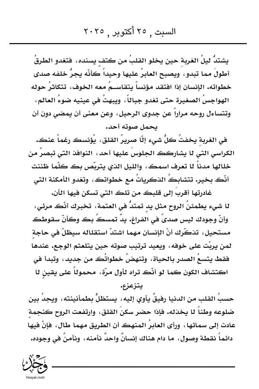 يشتدُّ ليلُ الغربةِ حين يخلو القلبُ من كتفٍ يسنده، فتغدو الطرقُ أطولَ مما تبدو، ويصبح العابرُ عليها وحيداً كأنّه يجرُّ خلفه صدى خطواته .. #حكاية_وجد #وجدان_الخطيفي #شعر #مجتمع #قصيد