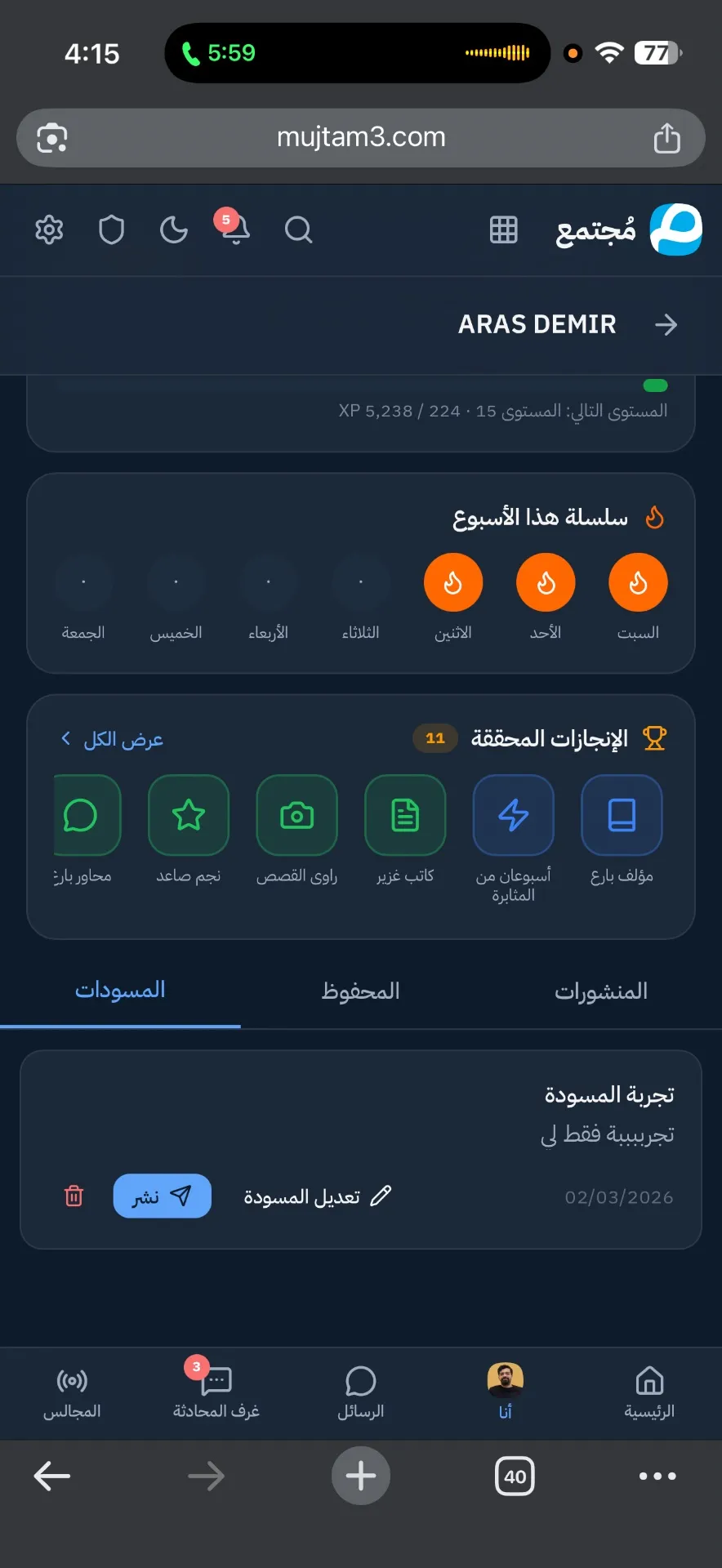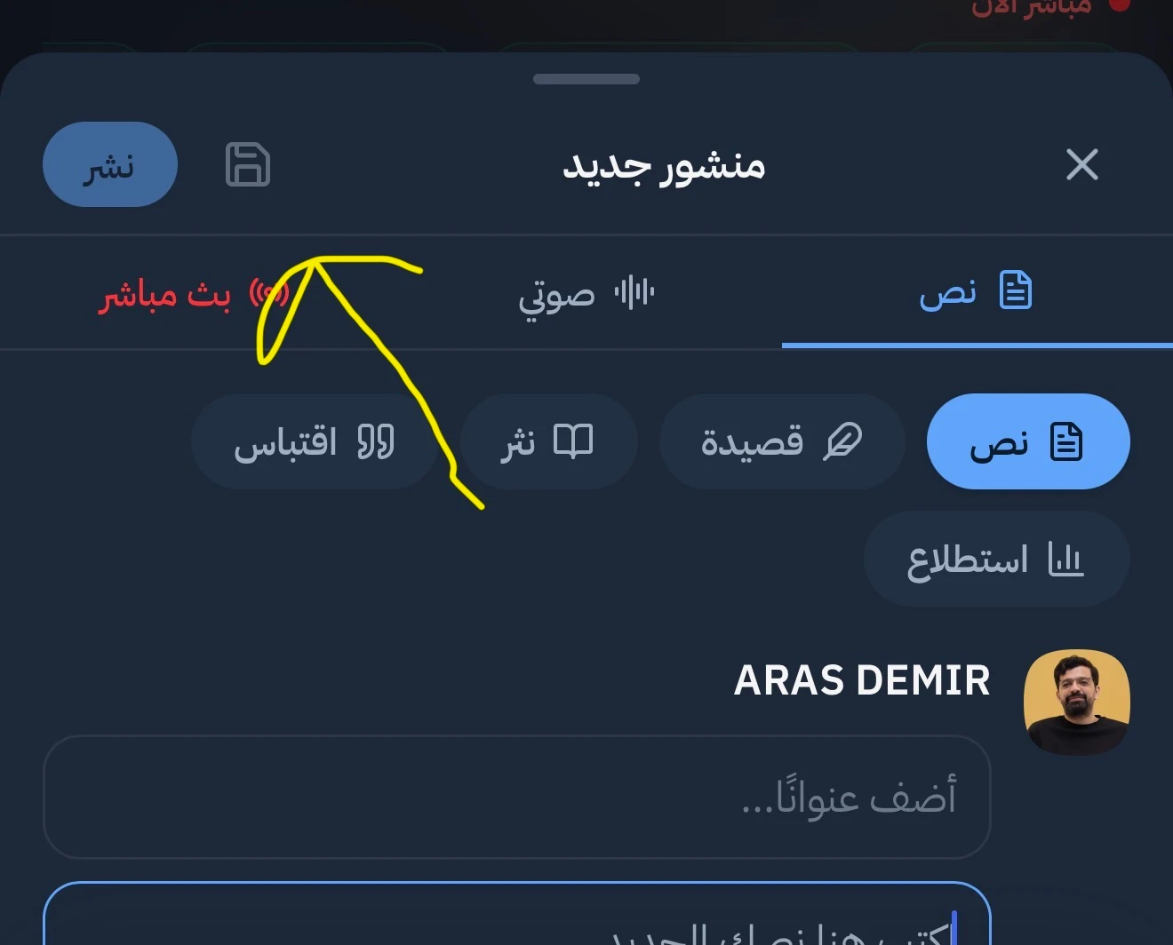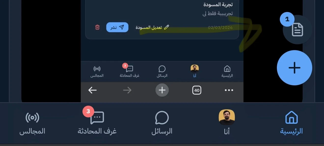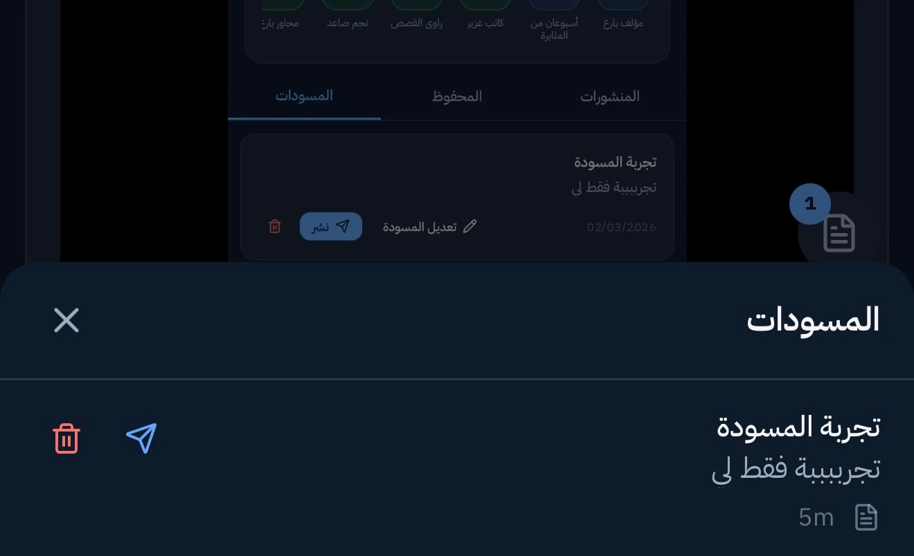 ستجدون الان زر جديد بجانب زر نشر للمسودات الخاصة بكم وتجدونها في ملفكم الشخصي كما في الصورة 🥳🥰✨ويمكنكم تعديلها ونشرها لاحقا او الاحتفاظ بها كمفكرة خاصة بكم #مجتمع