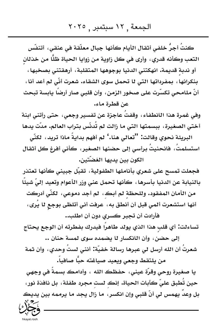 كنتُ أجرُّ خلفي أثقال الأيام كأنها جبال معلّقة في عنقي، أتنفّس التعب وكأنه قدري .. بقلم : وجدان الخطيفي #حكاية_وجد #وجدان_الخطيفي #شعر #مجتمع #قصيد