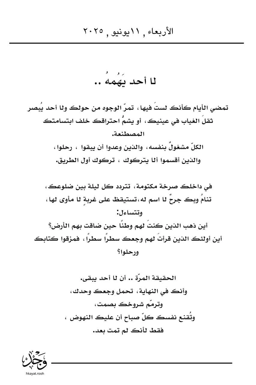 في داخلك صرخة مكتومة .. تتردد كل ليلة بين ضلوعك، تنامُ وبك جرحٌ لا اسم له .. #وجدان_الخطيفي #شعر #مجتمع #قصيد #الواي_فاي