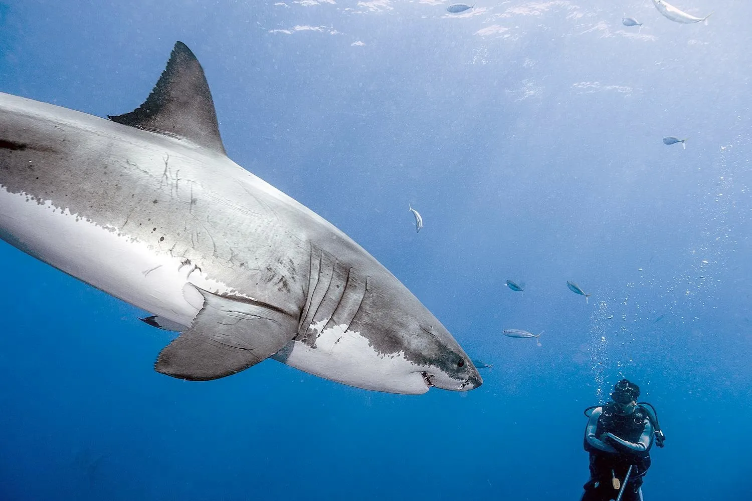 في هذه الصوره ستشاهدون أخطر كائن على وجه الأرض فهو يتسبب في مقتل الملايين كل عام! وبجانبه يسبح قرش أبيض مسالم