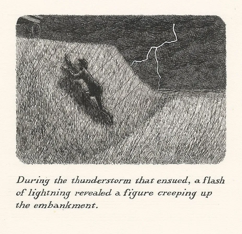 "أثناء العاصفة الرعدية التي تلت ذلك كشفَ وميضٌ من البرق عن شخصيةٍ تزحف على الجسر."