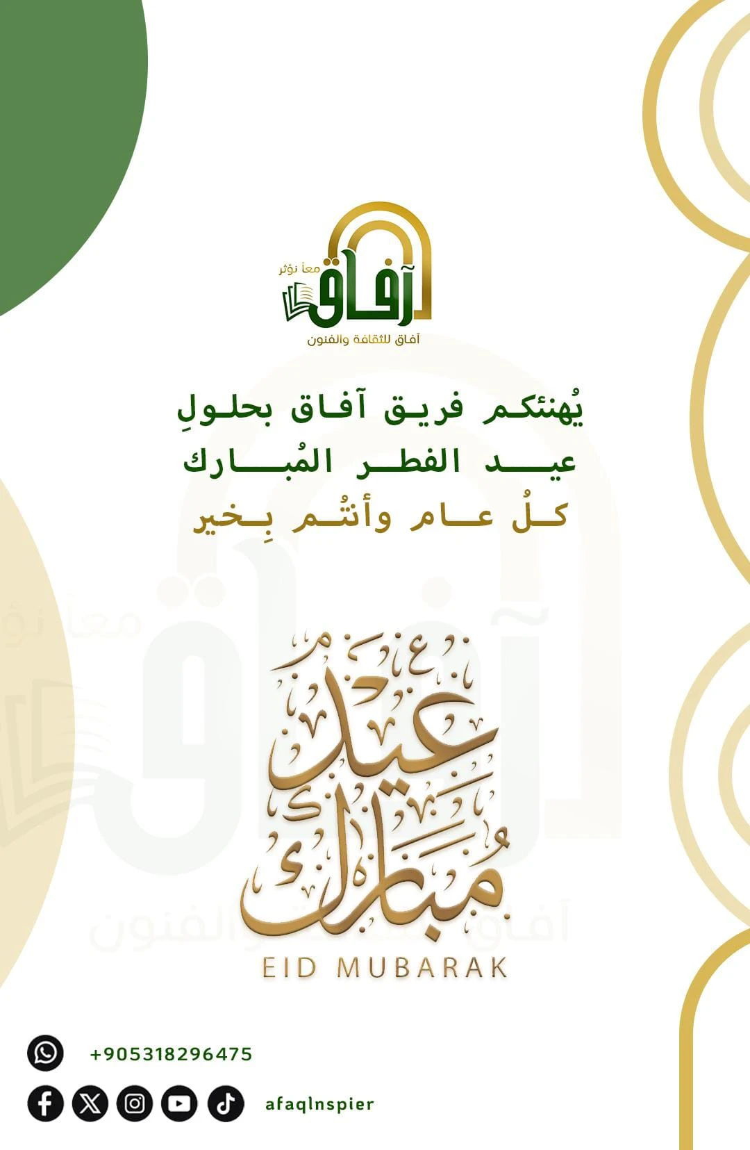 فريق افاق للثقافة والفنون يهنئكم بحلول عيد الفطر المبارك كل عام وانتم بخير 💚🤍 تقبل الله طاعتكم 🤲🏻🤍