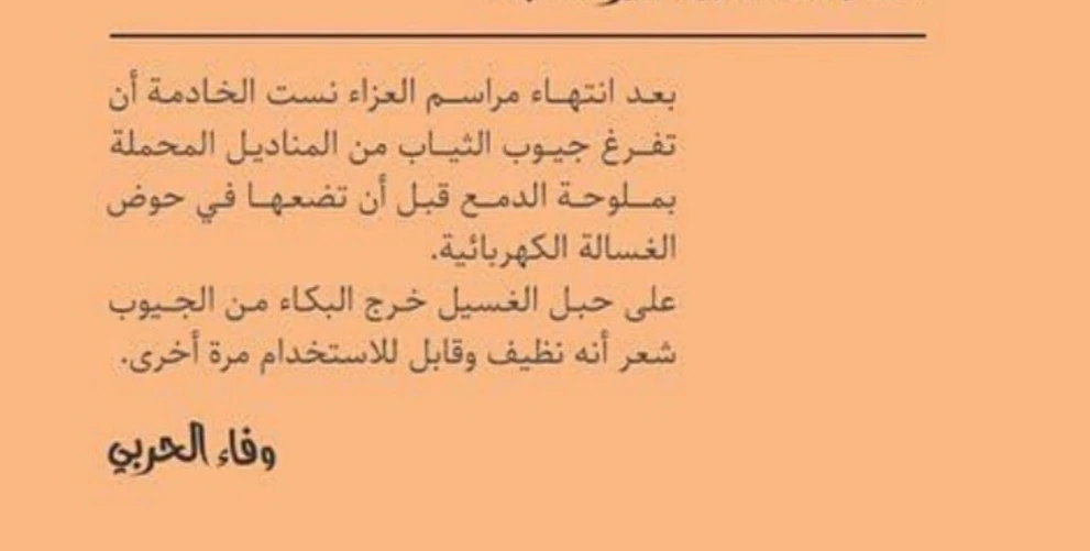 بعد إنتهاء مراسم العزاء نسيت الخادمة أن تفرغ جيوب الثياب من المناديل