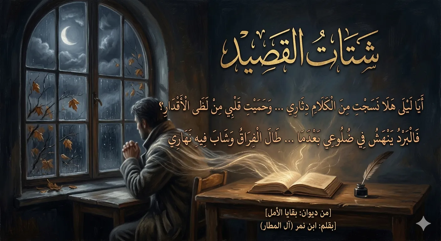 أَيَا لَيْلَى هَلَا نَسَجْتِ مِنَ الْكَلَامِ دِثَارِي ... وَحَمَيْتِ قَلْبِي مِنْ لَظَى الْأَقْدَارِ؟