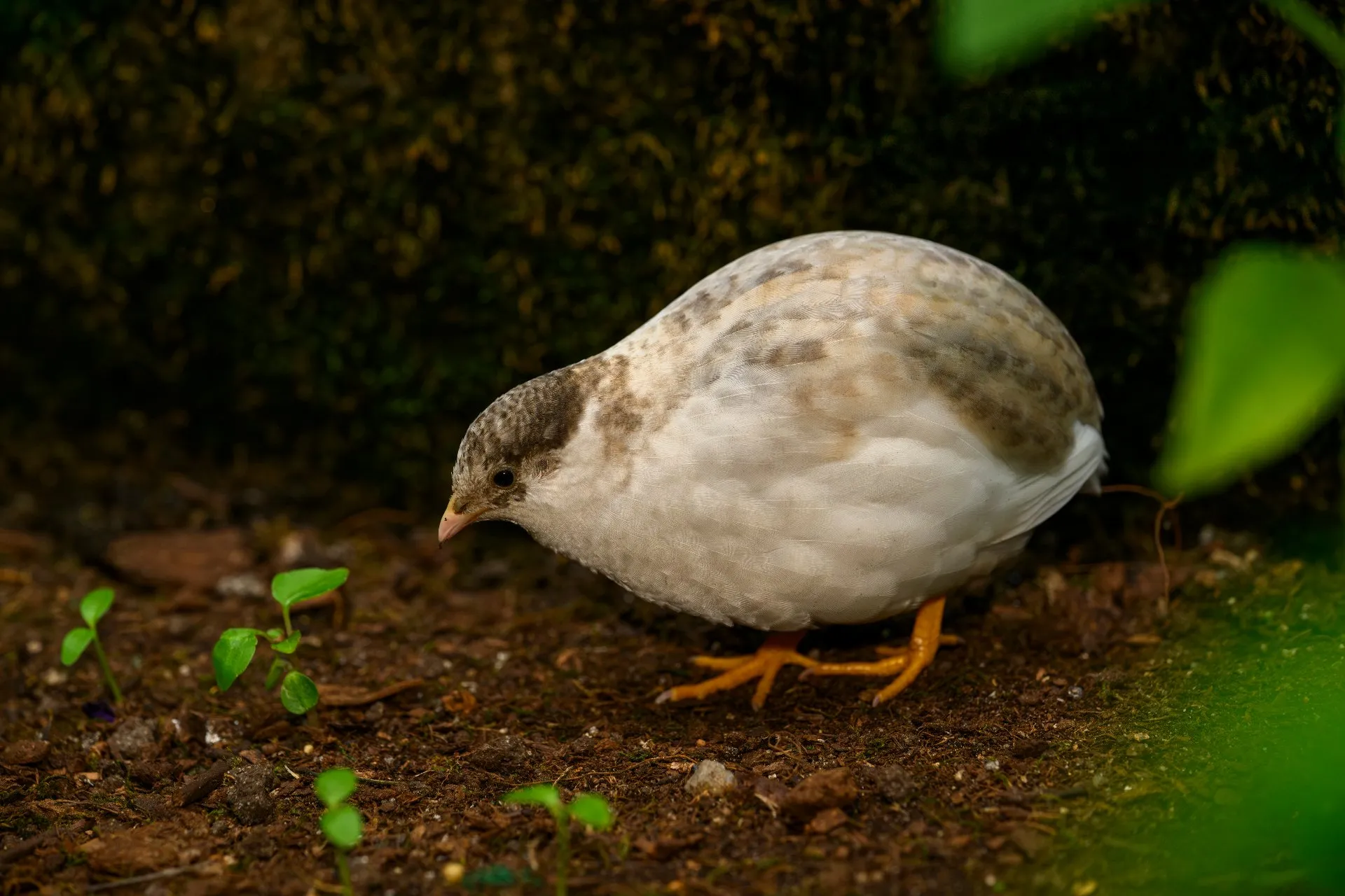 "هناك سرب صغير من السمان الملوّن يركض بسرعة على الأرض داخل محمية الفراشات حيث ينقر في التراب مثل الدجاج."