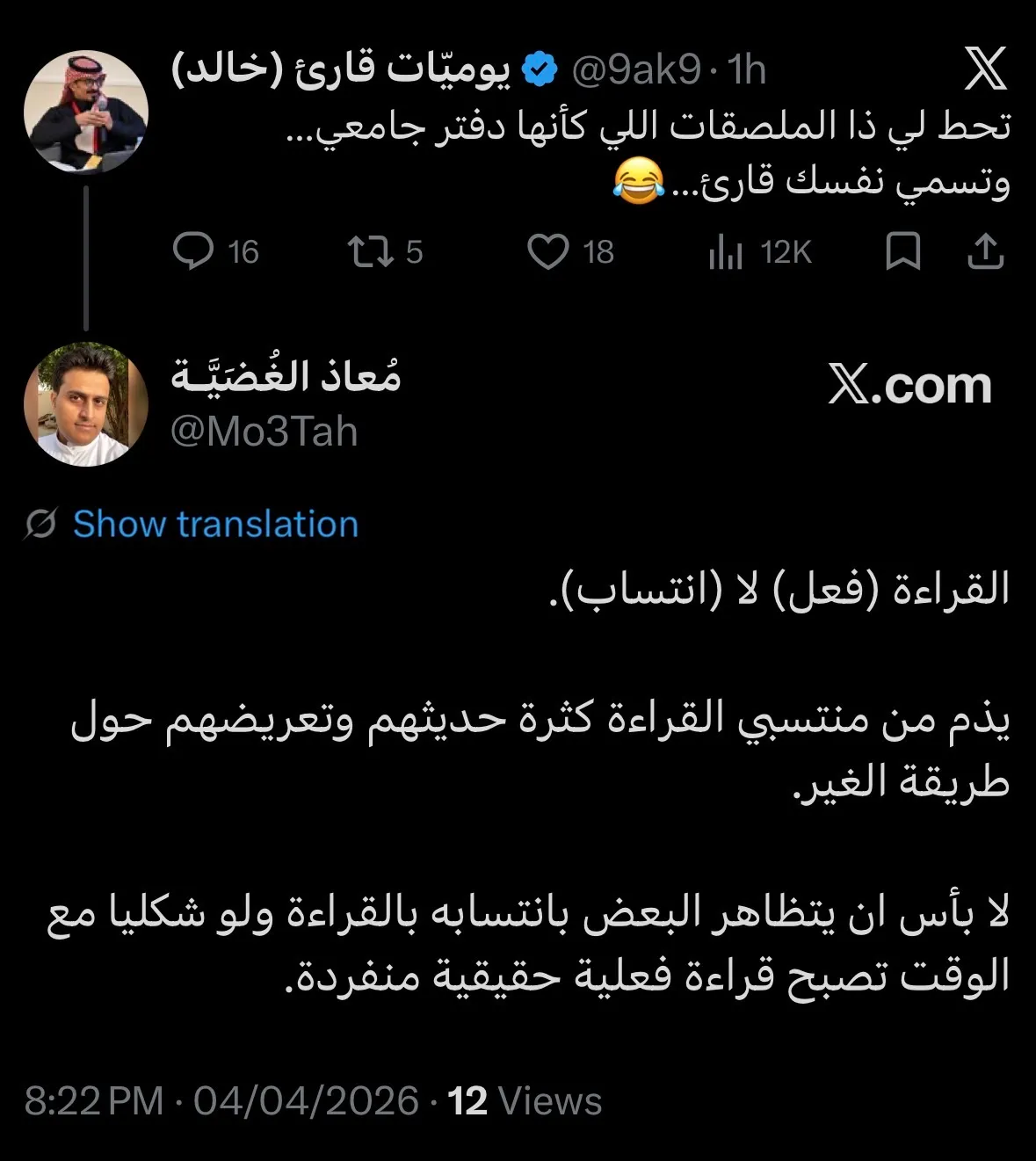نصيحتي واياكم ان تطلقوا الانتساب تحت اي مسمى (مثقف، كاتب، قارئ) هذا حساب شهير بأنه قارئ وسبق وحضرت له محاضرة قيمة عن القراءة لكن منشوره هنا معيب وينفر الناس عن فعل القراءة.