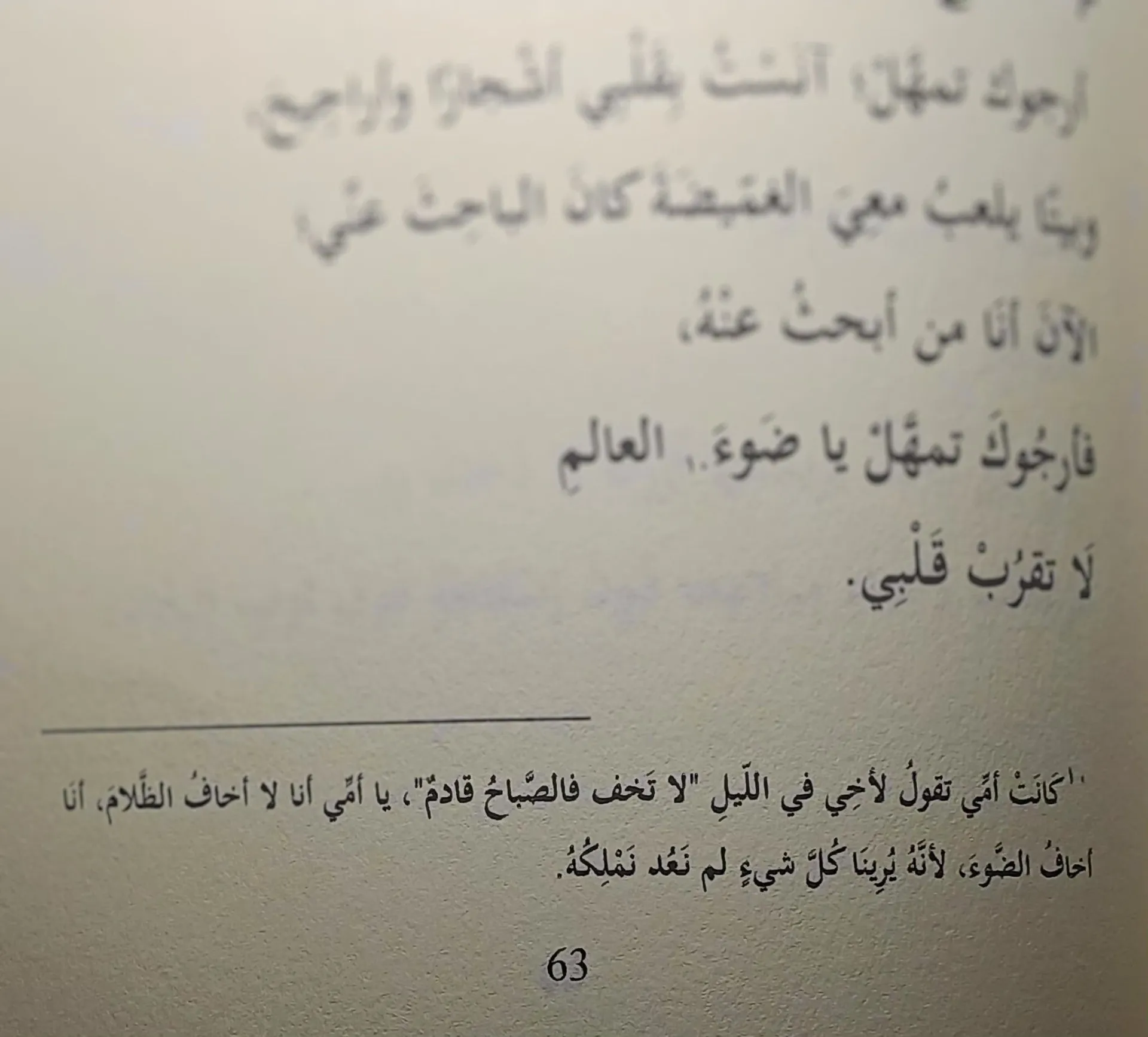 "...أنا أخافُ الضوءَ؛ لأنّهُ يرينا كلّ شيءٍ لم نعدْ نملكُه" _ هامِش قصيدة عالم جميل، عالم قاسٍ. ديوان: ألا يصدأَ- المفتاحُ يعدُ البيتَ.