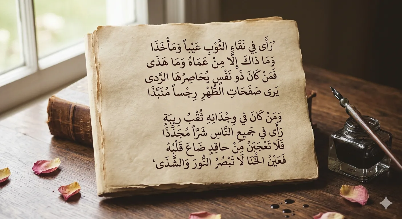 رَأى في نَقاءِ الثَّوبِ عَيْباً وَمَأخَذا ... وَما ذاكَ إلا مِنْ عَماهُ وما هَذى