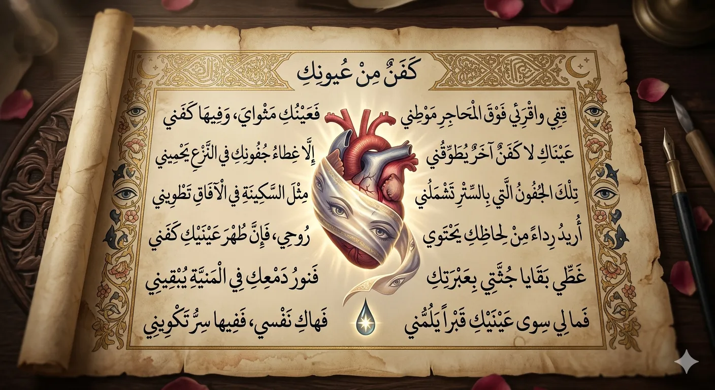 قِفي واقْرَئي فَوْقَ المَحاجِرِ مَوْطِني ... فَعَيْنُكِ مَثْوايَ، وَفِيها كَفَني