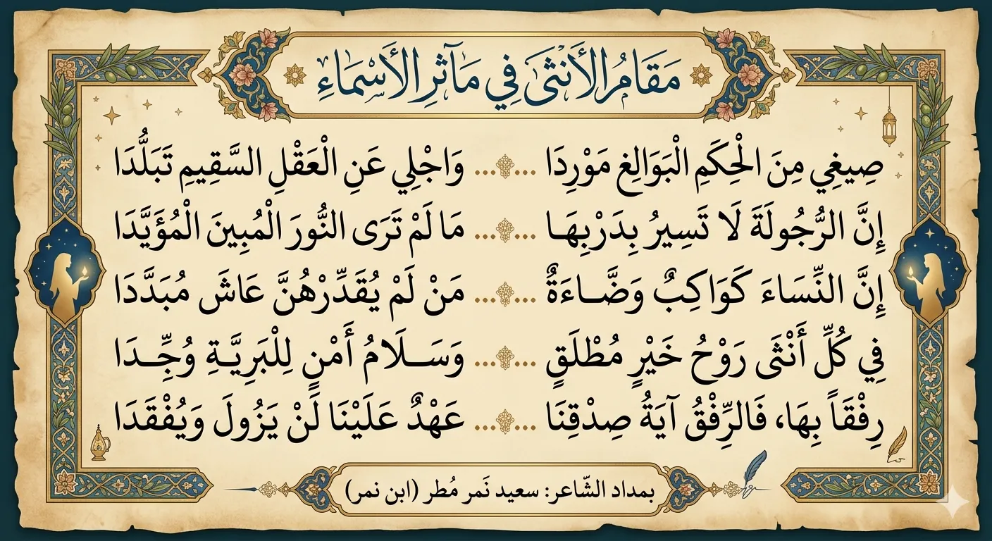 سُمِّيتِ "مَرْأَةَ" كَيْ تَكونِي لِلْمَرَا ... (أَيْ لِلْمُرُوءَةِ) مَنْبَعاً لَنْ يَنْفَدَا